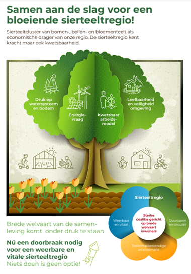 De sierteelt is een belangrijke economische drager in deze gemeenten. Het buitengebied ingeklemd tussen de grote steden is een sleutelgebied van (inter)nationaal belang. Het sierteeltcluster van bloemen-, boom- en bollenteelt is een uniek ecosysteem waarin kennis, innovatie, uitgangsmateriaal, veredeling, vermeerdering, verwerking, handel, logistiek en recreatie verweven is.